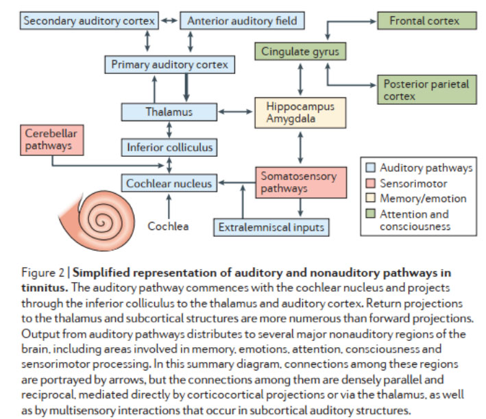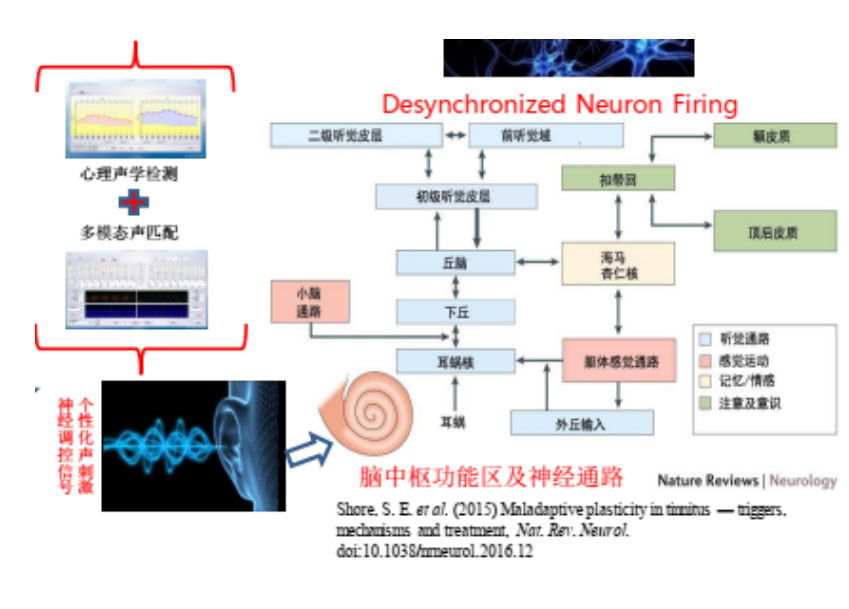 聲學(xué)信號(hào)通過(guò)耳蝸轉(zhuǎn)換成電信號(hào),沿著聽(tīng)神經(jīng)通路,傳入丘腦、皮層及相關(guān)腦區(qū),主動(dòng)調(diào)節(jié)和疏通 聽(tīng)神經(jīng)通路,強(qiáng)化過(guò)慮雜亂信號(hào)功能; 激活眾多神經(jīng)元,將因神經(jīng)紊亂引起的自發(fā)放電和從附近捕捉的信號(hào)去同步化(步調(diào)不一致),打亂耳鳴信號(hào)產(chǎn)生和抑制放大。
